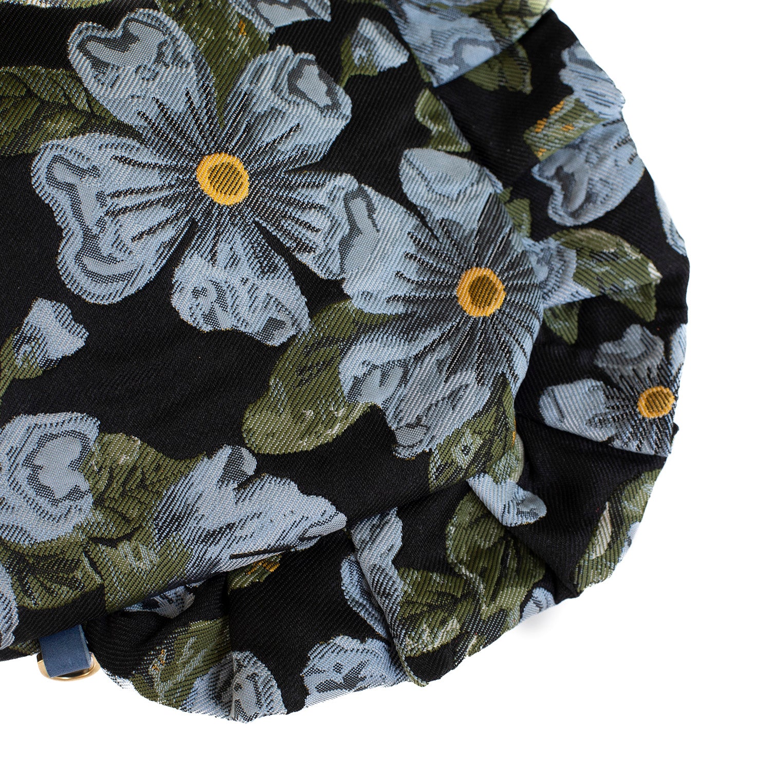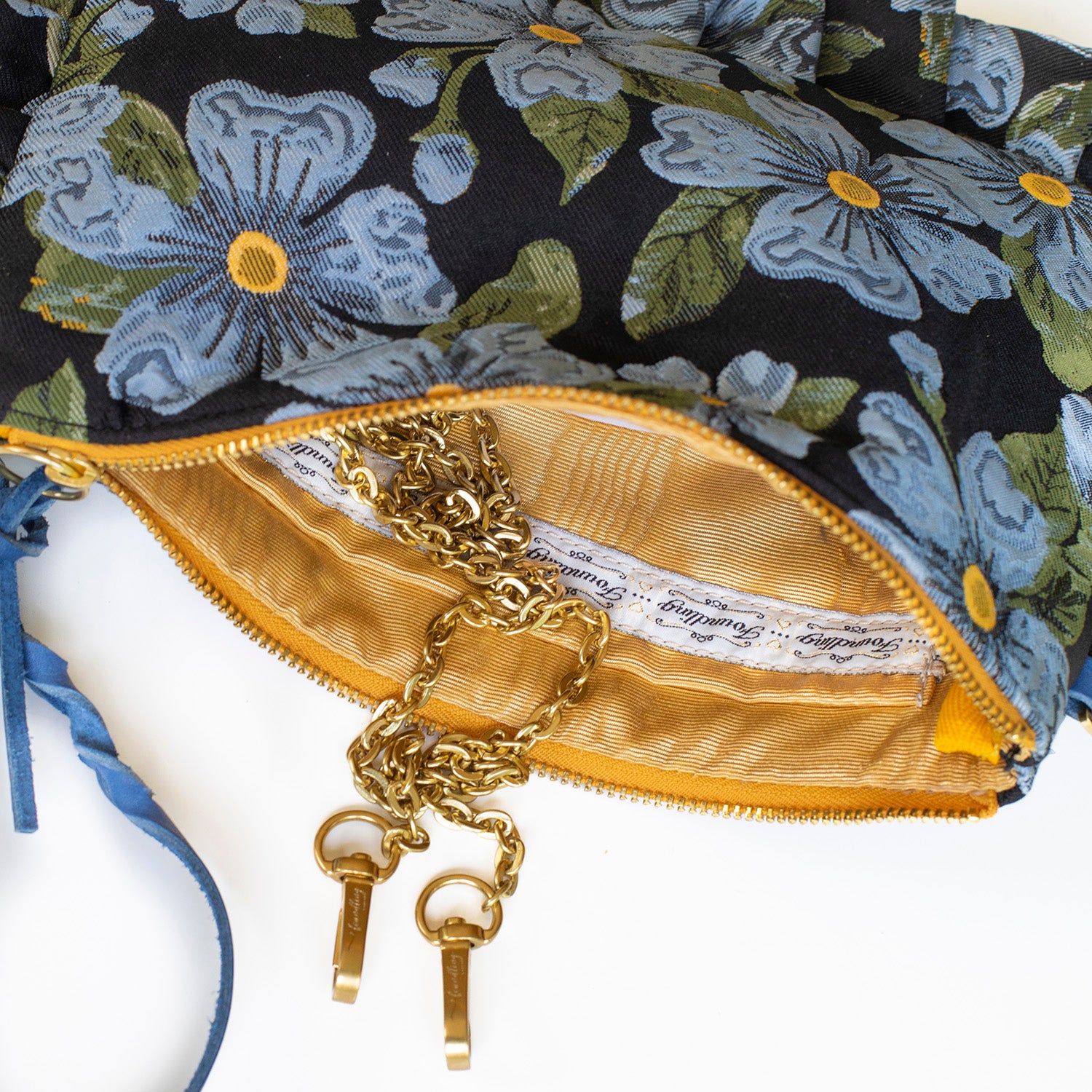 Large Blue & Yellow Wall flower with Green leaves. Black Brocade. Caramel Moiré Lining.