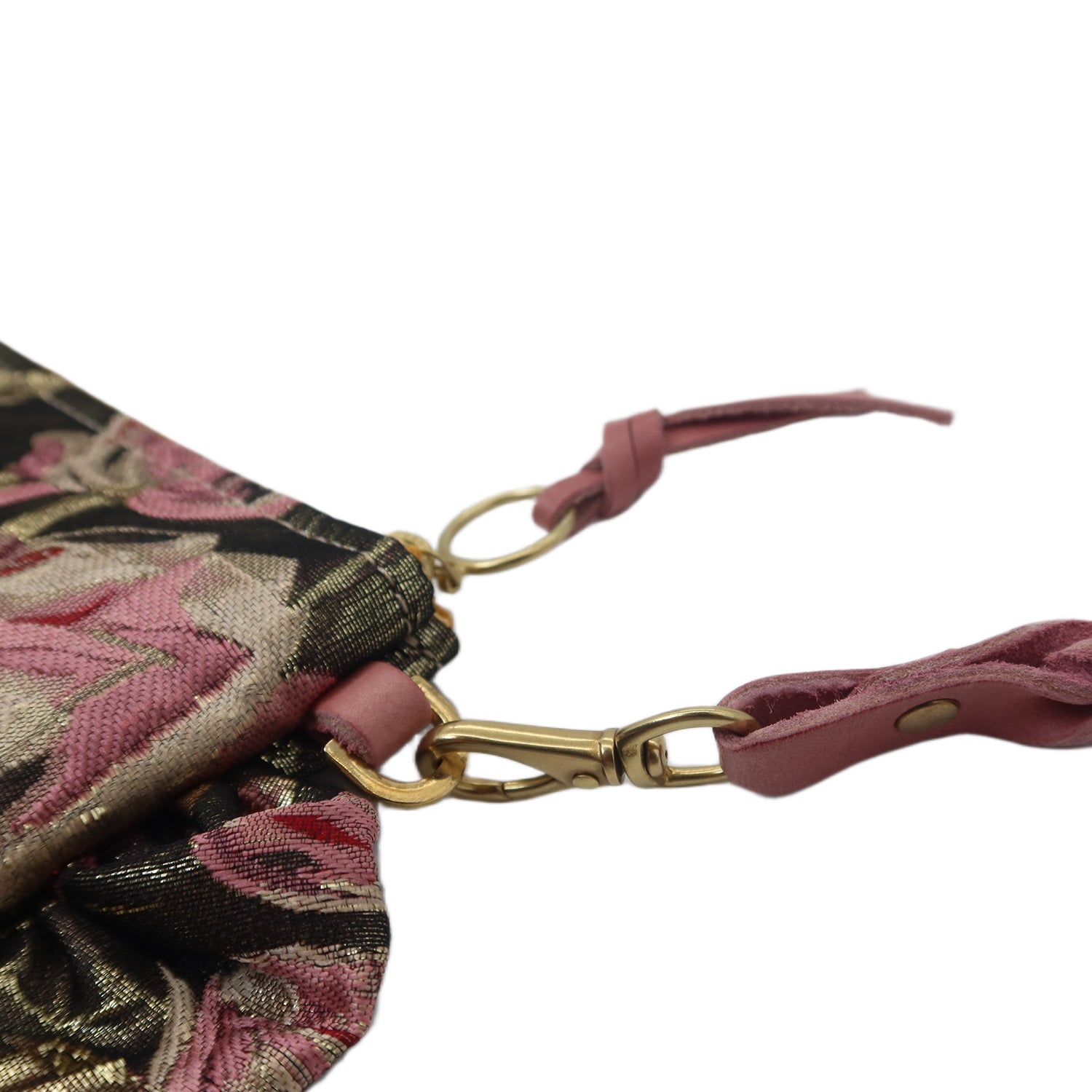 Retro Rose. Pink and Gold metallic. Caramel Moiré Lining.Yellow Gold Zip. Gold Finish Hardware.