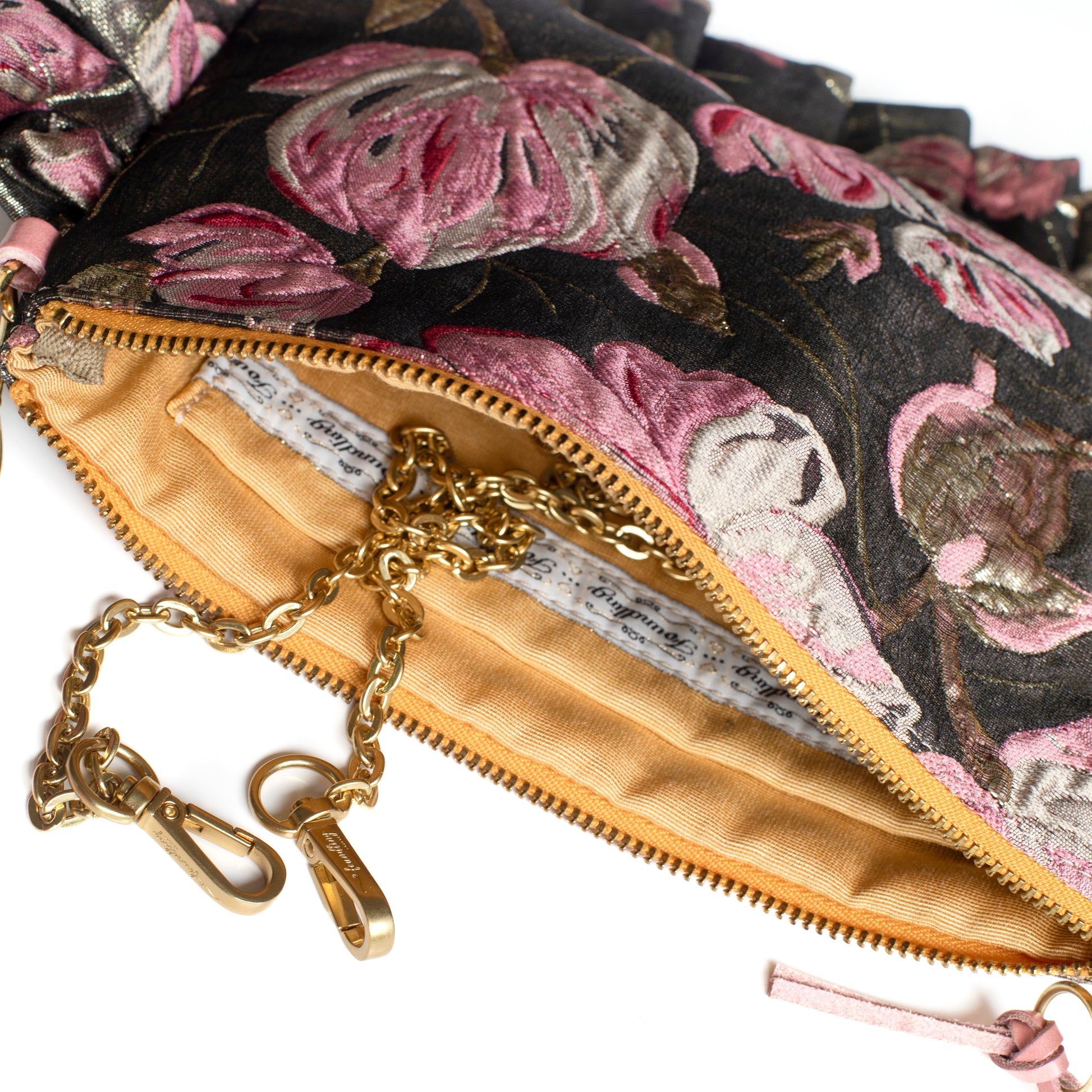 The 'Dolly' Frilly edged Bag is made from colourful woven Brocade or Fabric with a wavy Moiré Silk effect Lining. They are finely finished with an inside pocket and a Tafetta Woven Ribbon Label designed to look Vintage.
