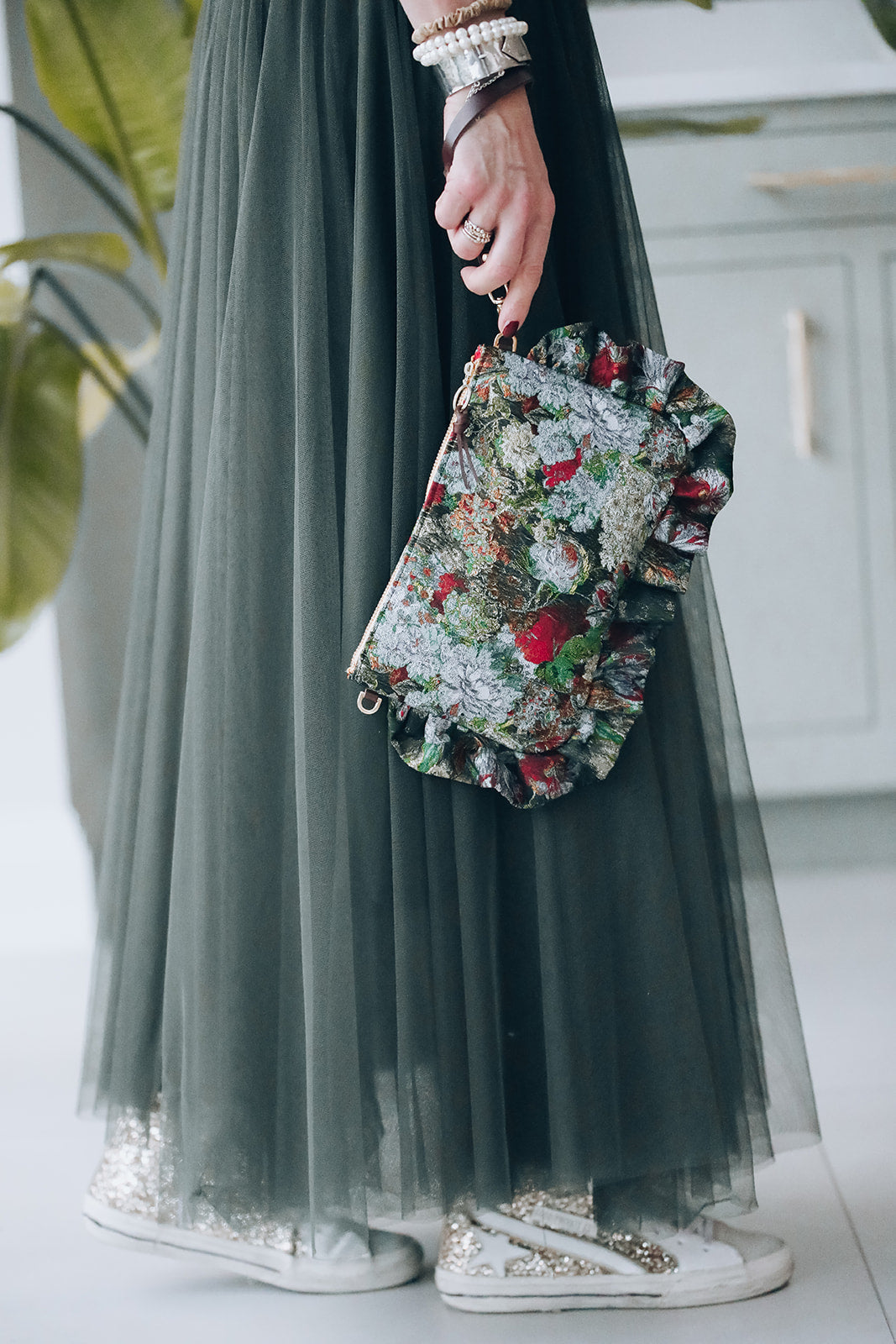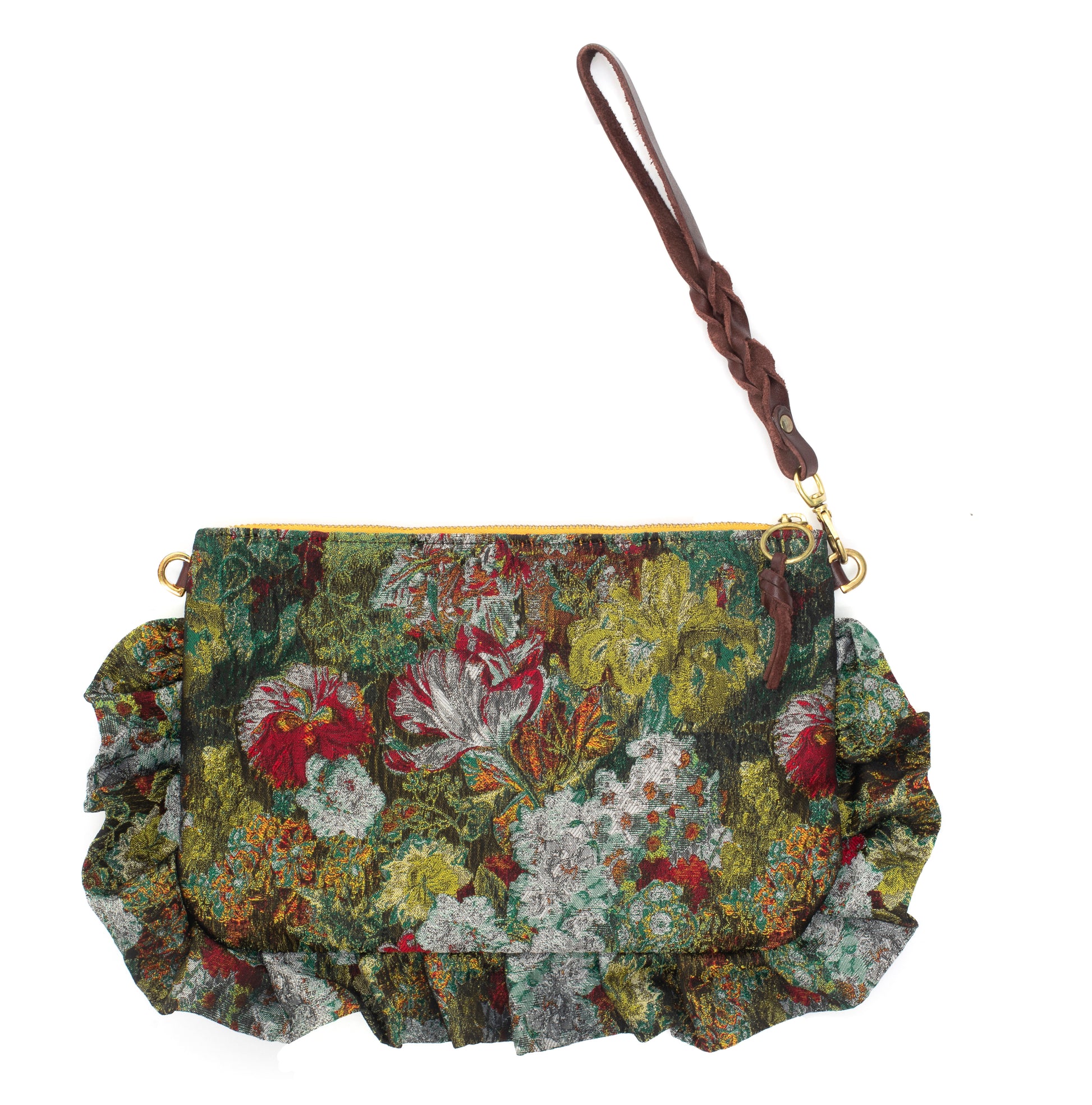 The 'Dolly' Frilly edged Bag is made from colourful woven Brocade or Fabric with a wavy Moiré Silk effect Lining. They are finely finished with an inside pocket and a Tafetta Woven Ribbon Label designed to look Vintage.