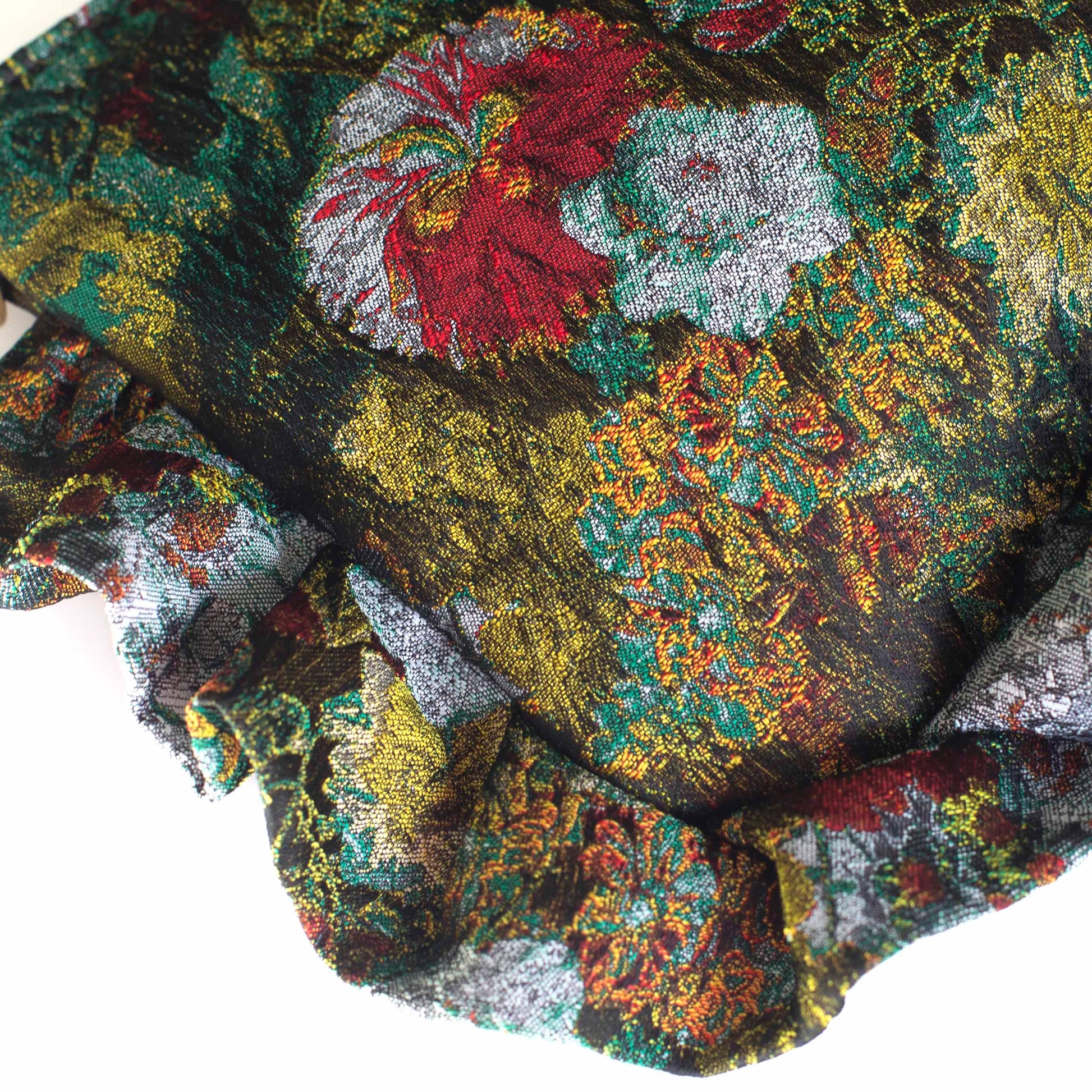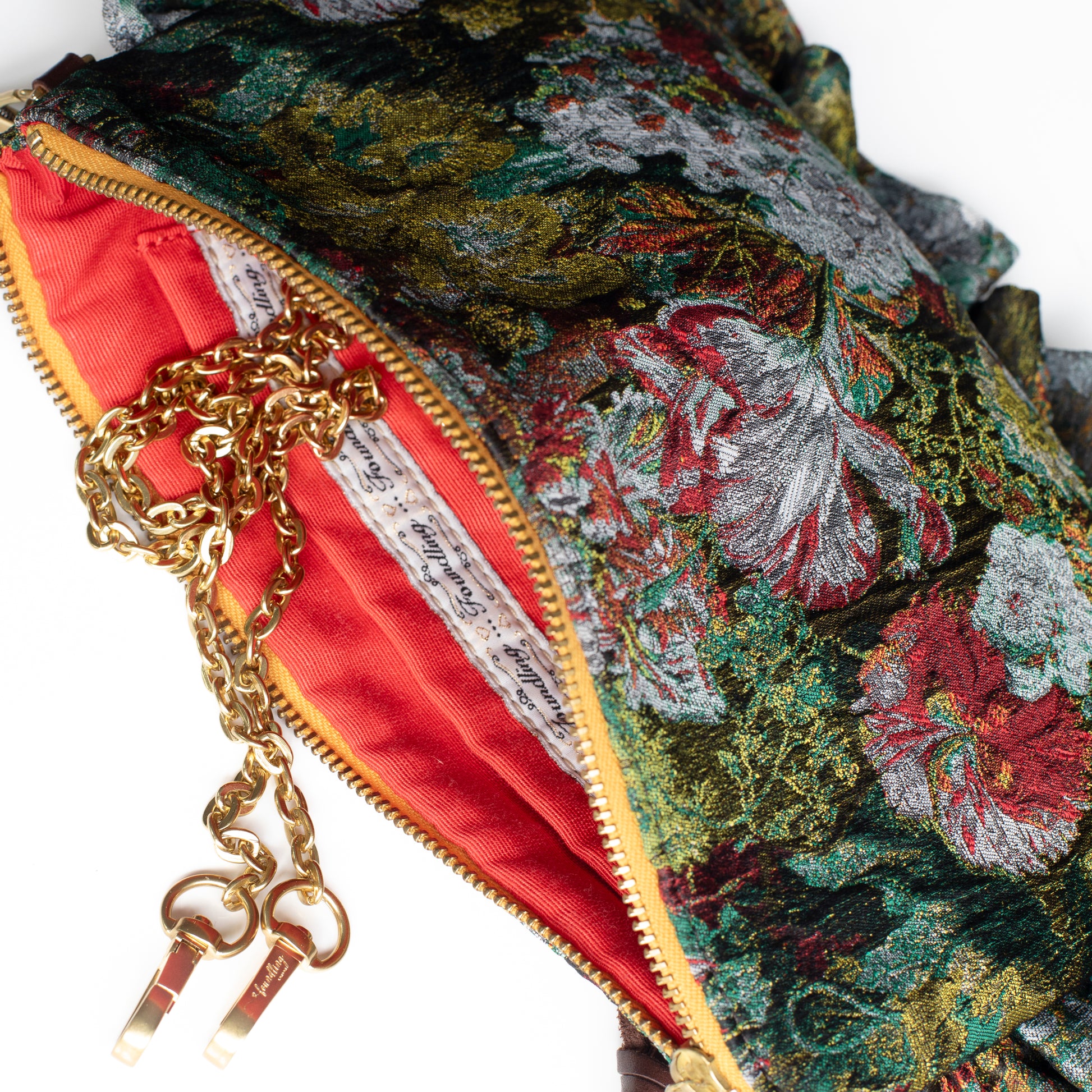 Scarlet Midnight Garden. Black, Greens, Red and Oche Multi Colour Brocade. Yellow Gold Zip. Vermillion Red Lining. Gold Finish Hardware